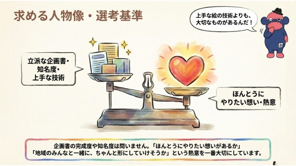 このプロジェクトでは、立派な企画書があるか、知名度があるかといったことは問いません。 私たちが一番大切にしているのは、**「ほんとうにやりたい想いがあるか」「地域のみんなと一緒に、ちゃんと形にしていけそうか」**という熱意です。