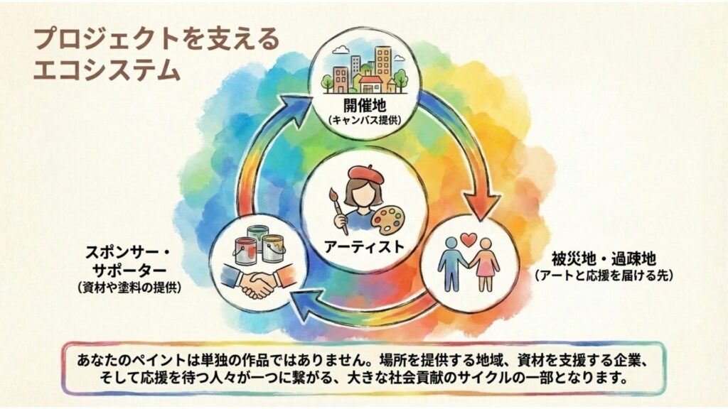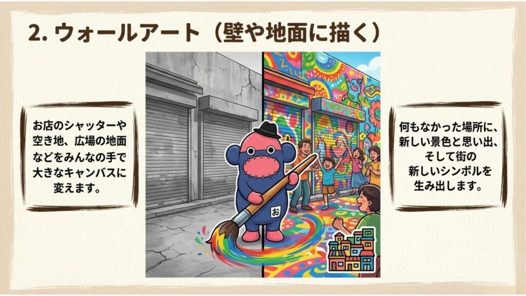 お店のシャッターや空き地の壁、広場の地面などをみんなの手で大きなキャンバスに変え、そこに新しい景色と思い出、そして街のシンボルを生み出します。
