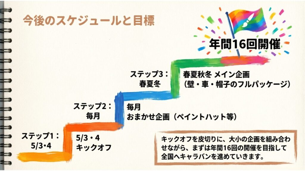 - 今後の目標:おまかせ企画(毎月)や、壁・車・帽子のフルパッケージで開催するメイン企画(春夏秋冬)を通じて、まずは年間16回の開催を目指して動いていきます。