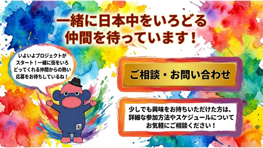 少しでも興味をお持ちいただけたアーティストの方は、詳細な参加方法やスケジュールについてお気軽にご相談ください!一緒に街をいろどってくれる仲間からの熱い応募をお待ちしています!