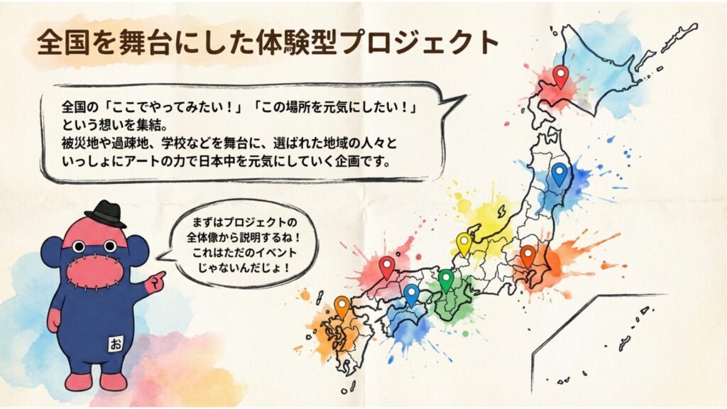 全国のみんなからの「ここでやってみたい!」「この場所を元気にしたい!」という想いを集め、選ばれた地域の人々といっしょにつくっていく特別な体験型プロジェクトです。被災地や過疎地、観光地をはじめ、学校や施設など様々な場所を舞台に、アートの力で日本中を元気にしていくことを目指しています。