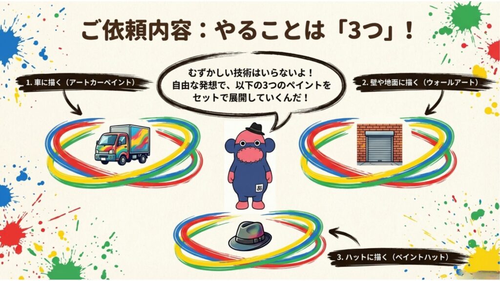 「むずかしい技術はいらないよ!自由な発想で、以下の3つのペイントをセットで展開していくんだ!」