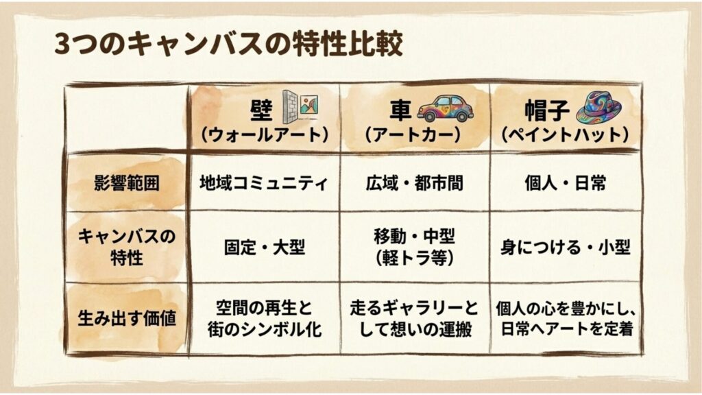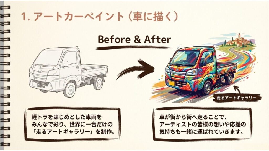 軽トラをはじめとした車両をみんなで彩り、世界に一台だけの「走るアートギャラリー」をつくります。車が街から街へ走ることで、アーティストの皆様の想いや応援の気持ちも一緒に運ばれていきます。 (※今回の募集では、前回お伺いした通り「軽トラ」へのペイントをメインとして想定しています)