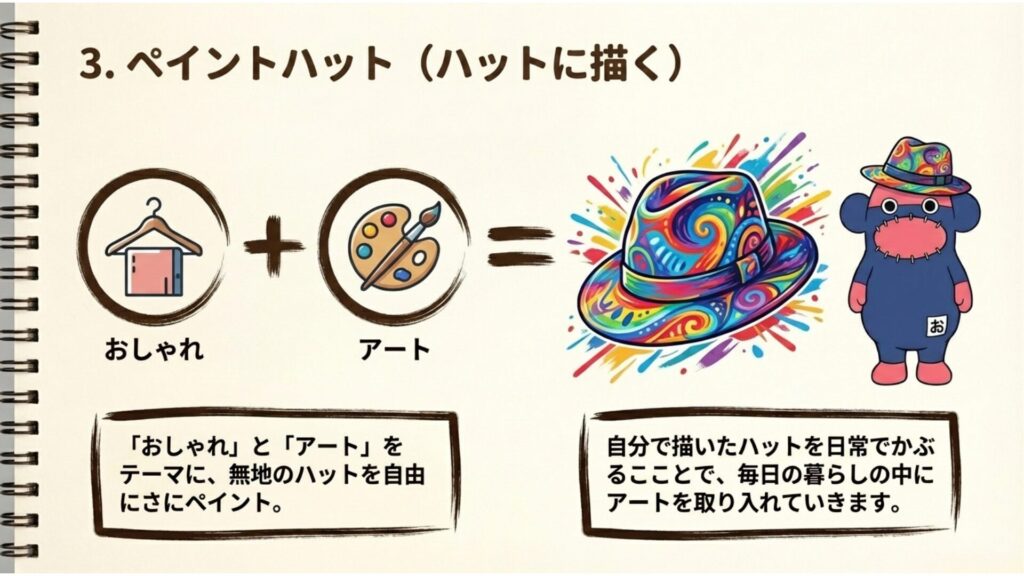 「おしゃれ」と「アート」をテーマに、無地のハットに自由にペイントします。自分で描いたハットを日常でかぶることで、毎日の暮らしの中にアートを取り入れていきます。