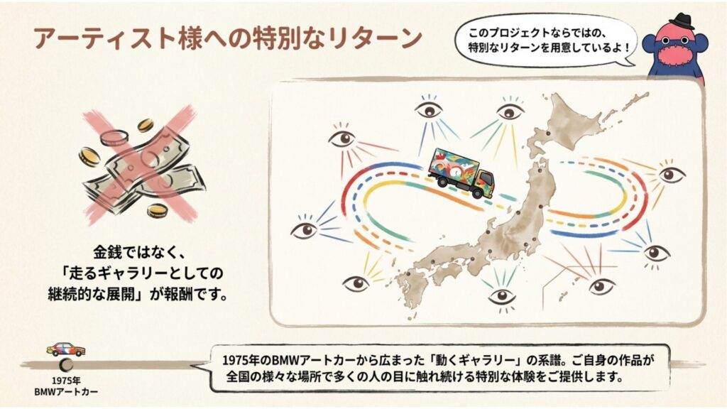 本プロジェクトでの報酬は金銭ではなく、「軽トラにアートを描くことで、ご自身の作品が『走るアートギャラリー』として継続的に展開されていくこと」です。 1975年の「BMWアートカー」から広まったように、ただの乗り物が街と街をつなぐ「動くギャラリー」となり、ご自身の作品が全国の様々な場所で多くの人の目に触れ続ける特別な体験をご提供します。